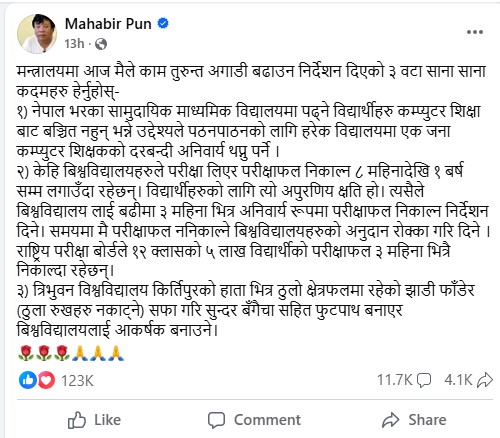 काठमाडौँ । शिक्षा,विज्ञान तथा प्रविधिमन्त्री महावीर पुनले कर्मचारीहरूलाई विभिन्न निर्देशन दिएका छन् । उनले मंगलबार सामाजिक सञ्जाल फेसबुकमार्फत तीन बुँदे निर्देशन दिइएकाे जानकारी गराए ।